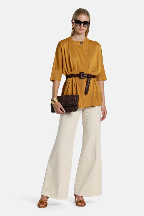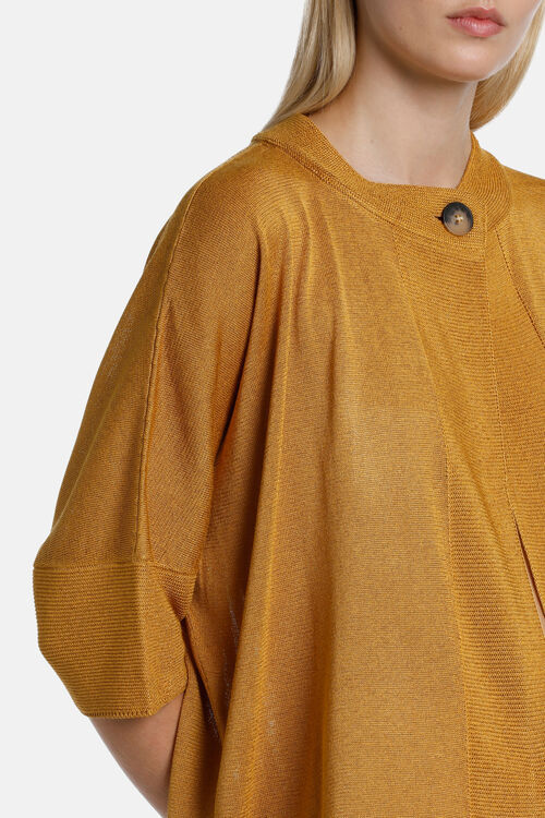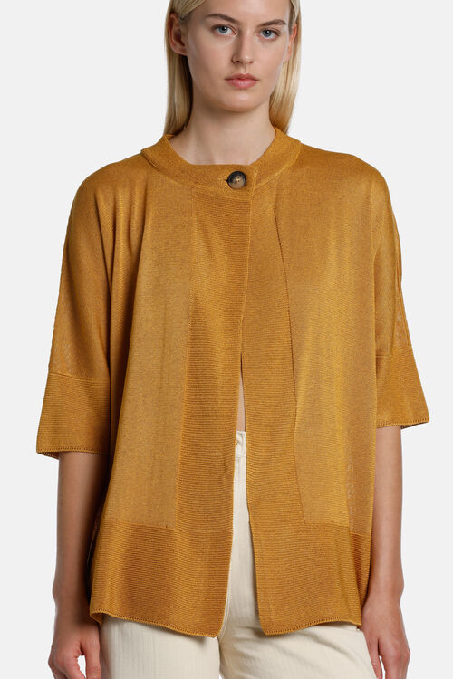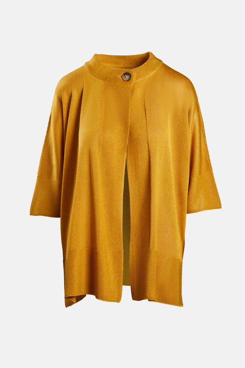 Жакет из вискозного трикотажа на пуговице. Имеет рукава 3/4 и рельефный шов сзади. Классический крой.