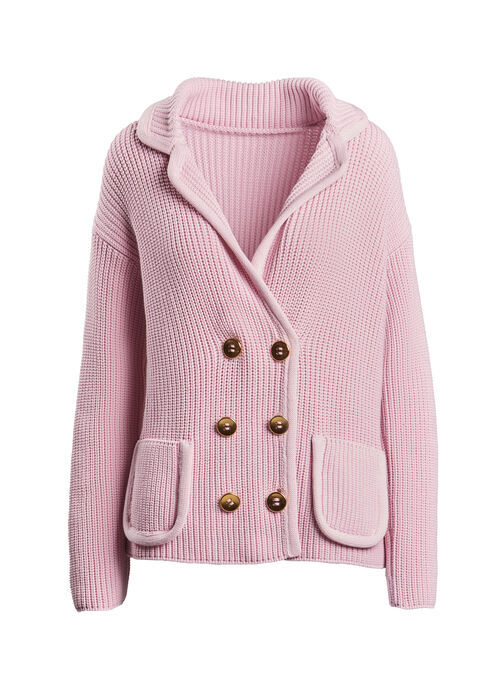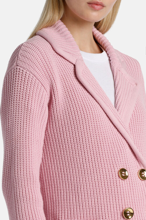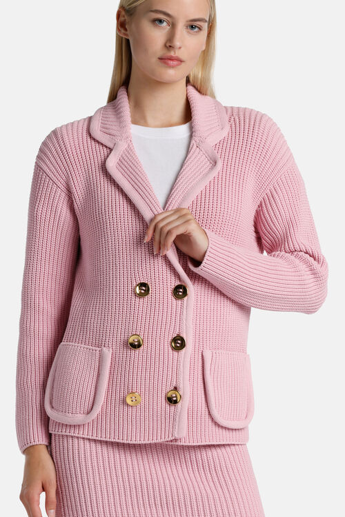 Двубортный пиджак из трикотажного хлопка. Классические лацканы, контрастные пуговицы, спущенные плечи и накладные карманы. Классический крой.