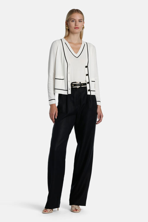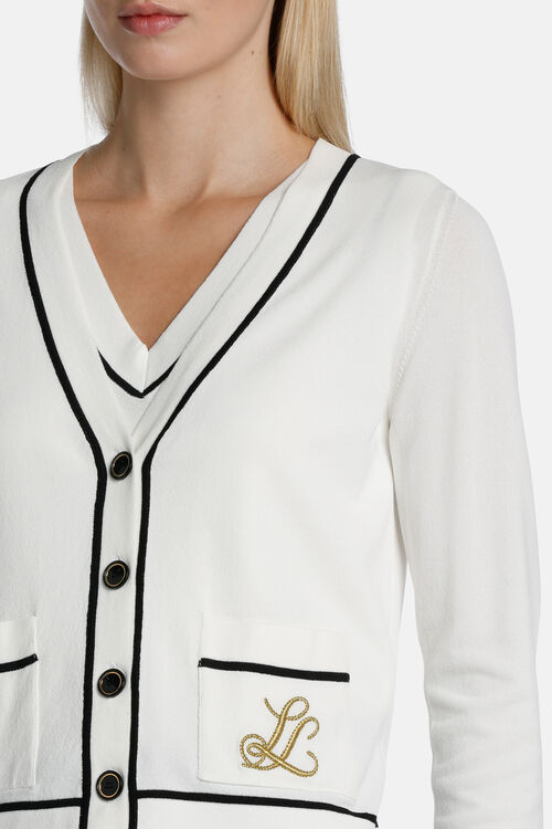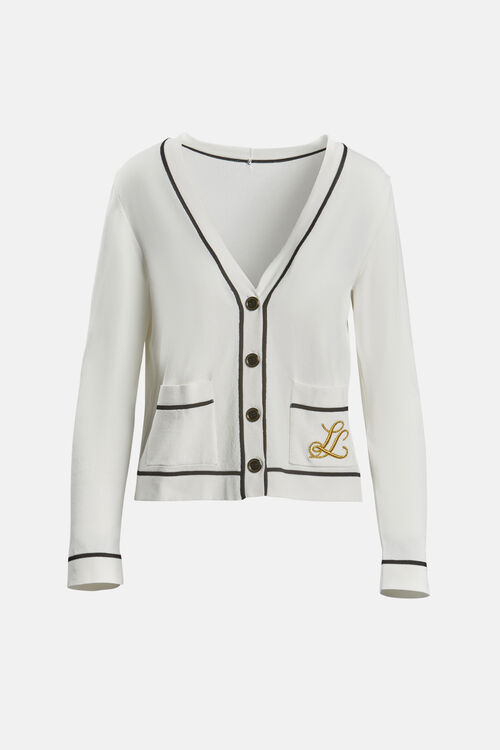 Кардиган бритой вязки из вискозы. Контрастная окантовка, вышитая золотом надпись «LS», накладные карманы. Укороченная длина. Классический крой.