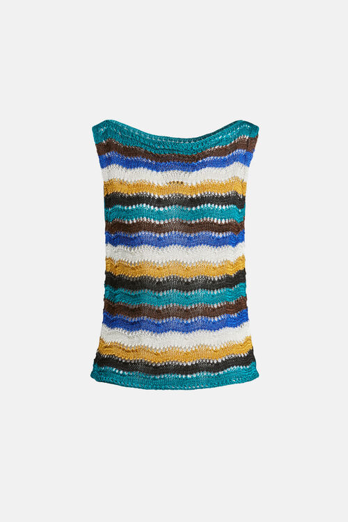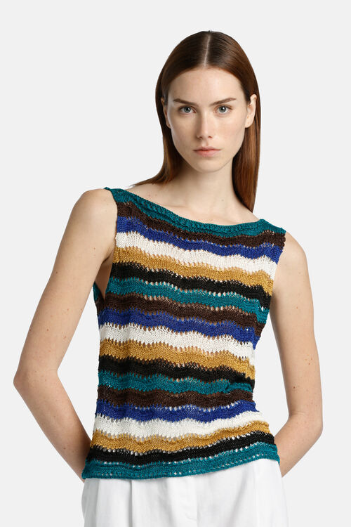 Перфорированный трикотажный топ из смесового льна с волнистым узором. Вырез лодочкой. Классический крой.