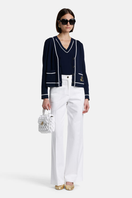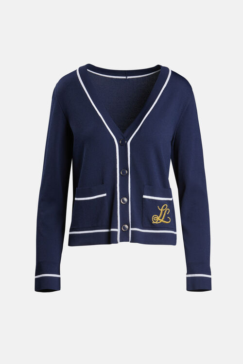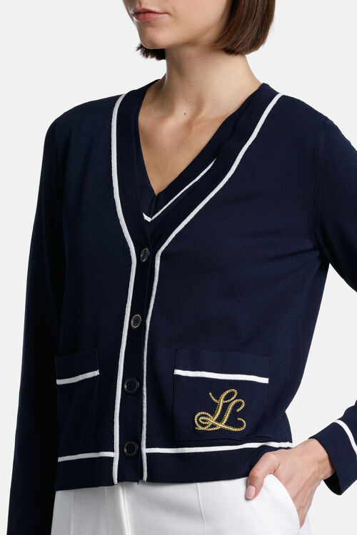 Кардиган бритой вязки из вискозы. Контрастная окантовка, вышитая золотом надпись «LS», накладные карманы. Укороченная длина. Классический крой.