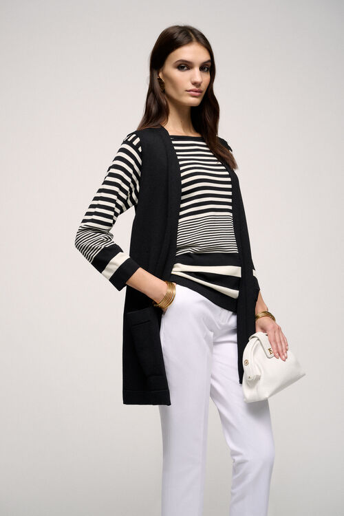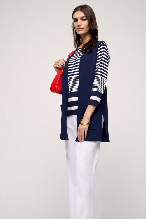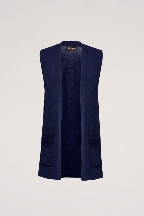 Открытый жилет из смесовой вискозы, без пуговиц, с накладными карманами и отделкой в рубчик. Классическая посадка.