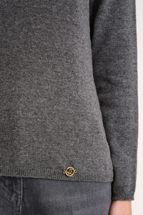 Пуловер из смешанного кашемира. Свитер с ложным воротом, тонкой рубчатой отделкой, позолоченной металлической аппликацией «LS» возле подола. Классический крой.