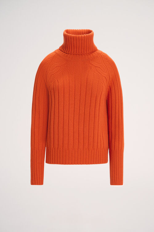 Водолазка-свитер из чистой натуральной шерсти с плоской ребристой вязкой. Рукава реглан с косичным узором, высокие манжеты. Классический крой.