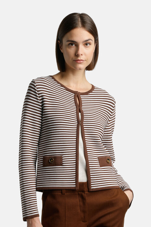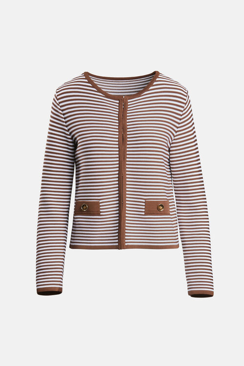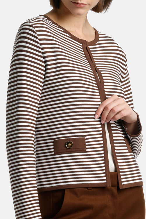 Кардиган Bon ton в полоску из вискозного трикотажа. Круглый вырез, застежка на невидимые крючки и однотонные детали. Укороченная длина. Классический крой.