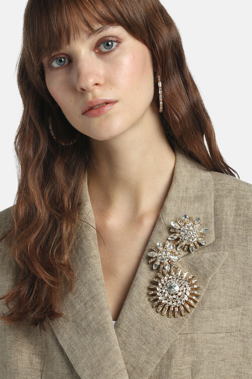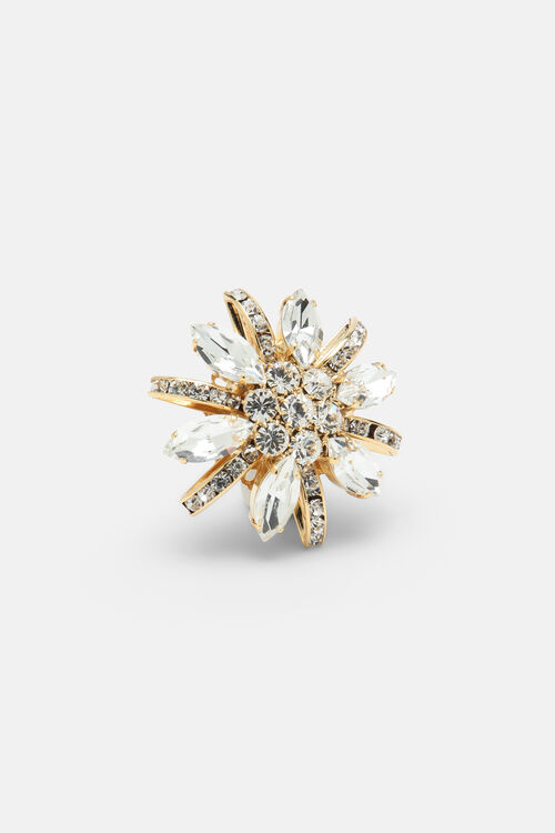Брошь с цветочным дизайном, состоящая из кристаллов, вставленных в золотистую латунь.
