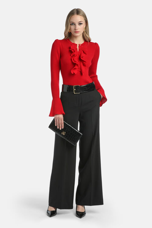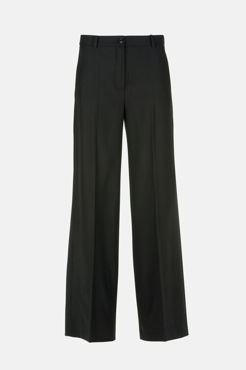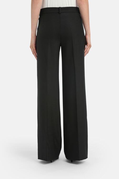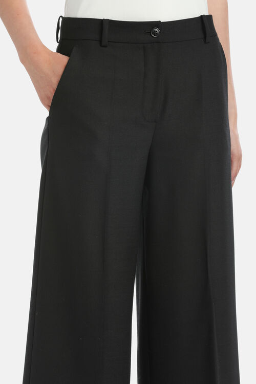 Брюки-палаццо из смесовой шерсти с заутюженными складками спереди и сзади, шлевками на талии, застёжкой на молнию и пуговицы. Классический крой.