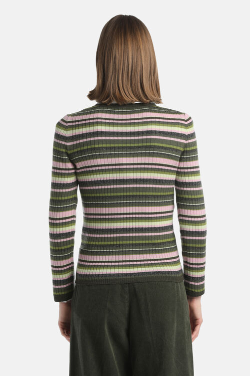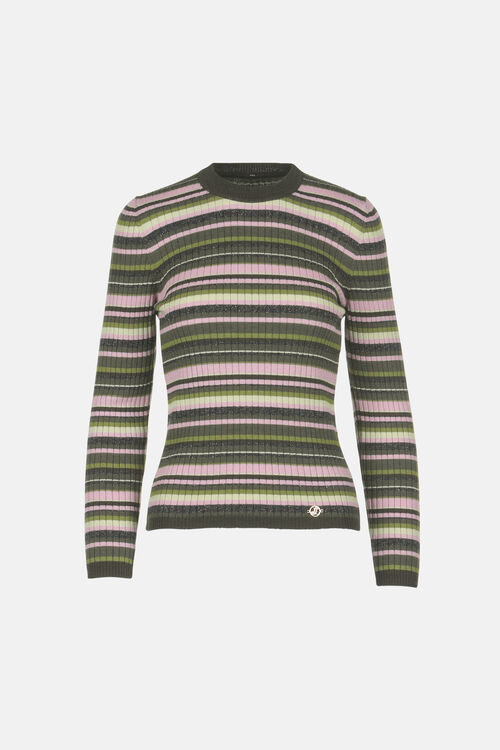 Круглый вырез горловины, приталенный крой, полосатый узор, золотистый металлический логотип «LS» на подоле.