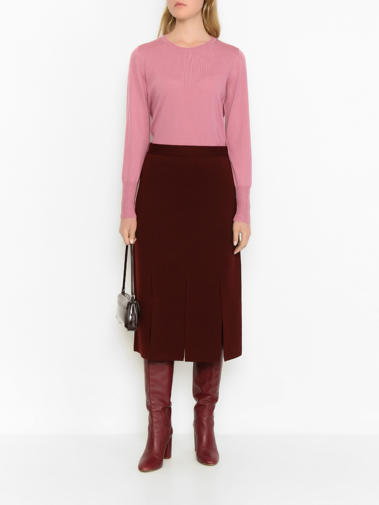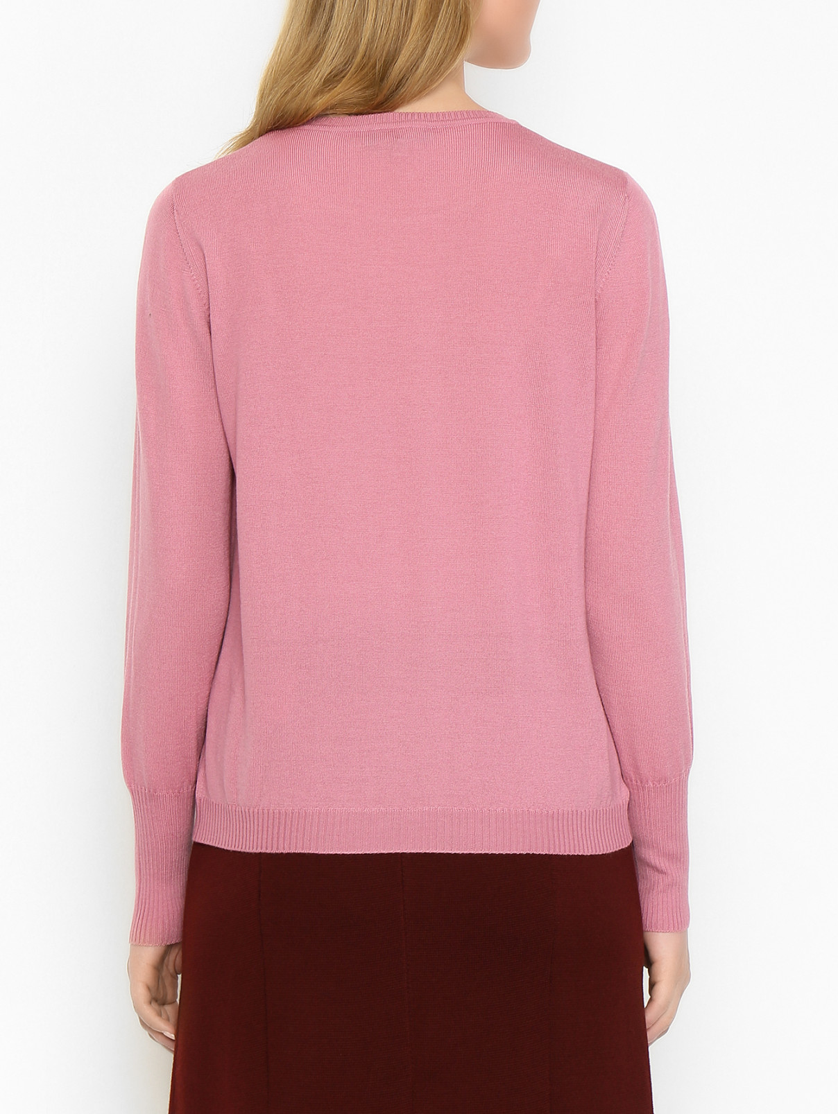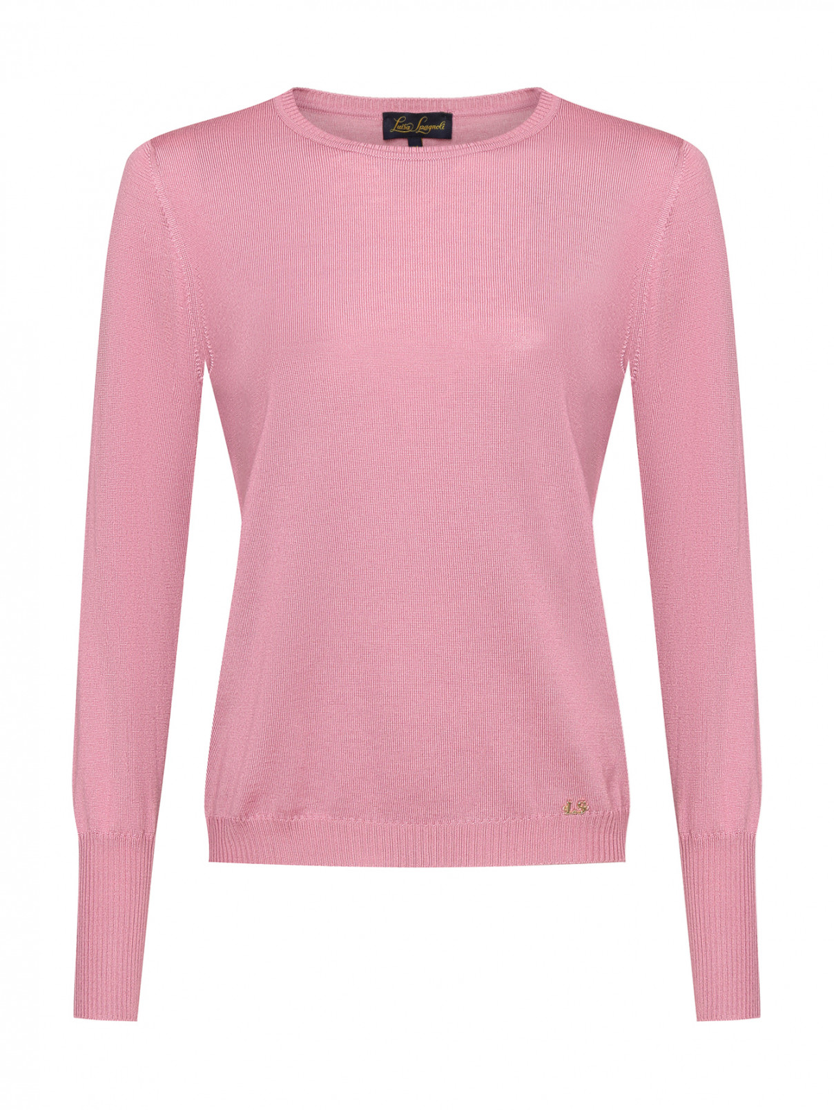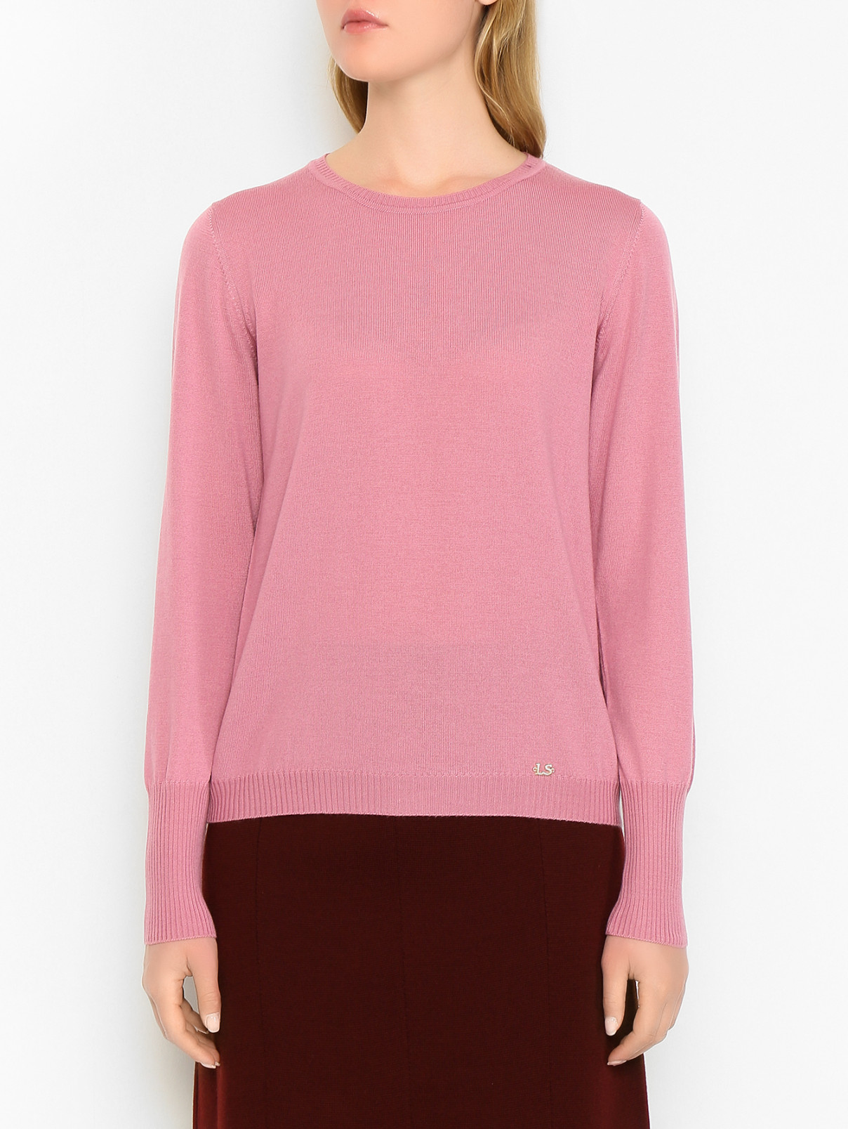Джемпер из чистой шерсти гладкой вязки с круглым вырезом и длинными рукавами. Классический крой.