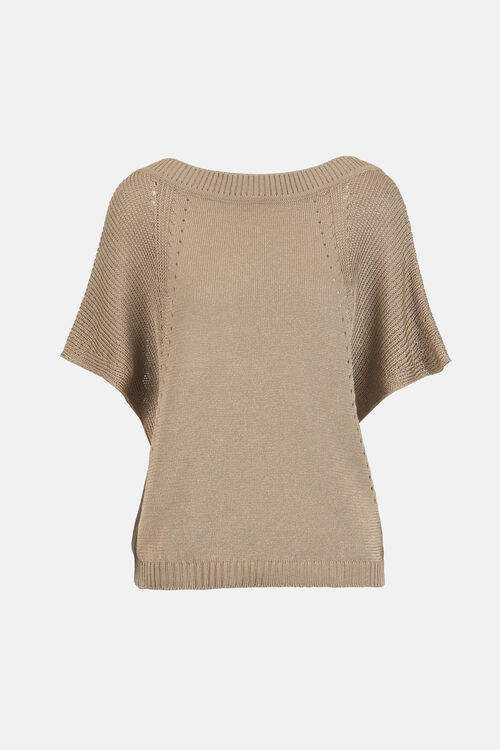 Тонкий трикотажный джемпер, лен и вискоза, с ажурной отделкой. Ребристы отделки и короткие рукав кимоно. Обычная посадка.