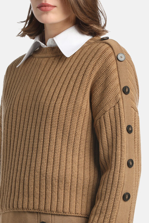 Джемпер из 100% шерсти -вязка лапша. Декорирован фирменными пуговицами в доль линии плеча и рукава. Имеет круглый вырез. Гармонично сочетается с брюками и юбками из ткани любой фактуры.Сделано в Молдове.