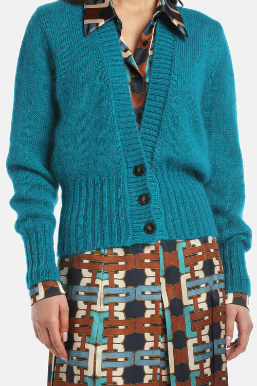 Укороченный кардиган из шерстяной пряжи с глубоким вырезом.