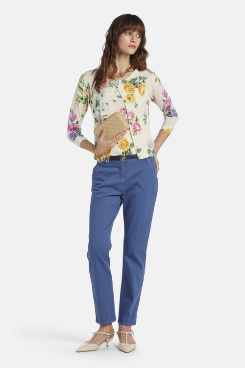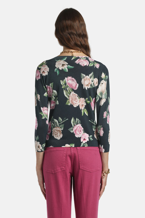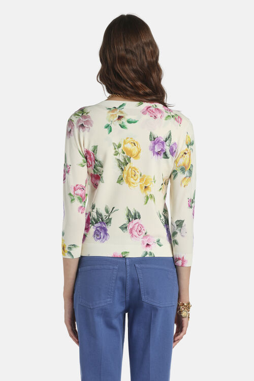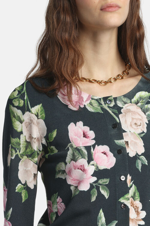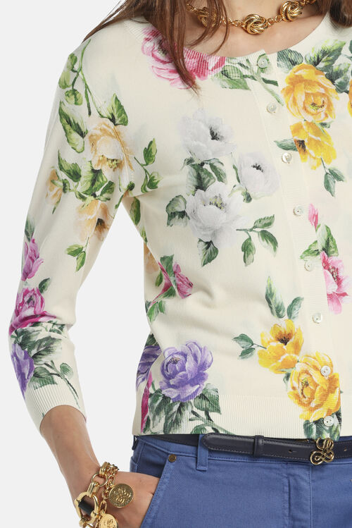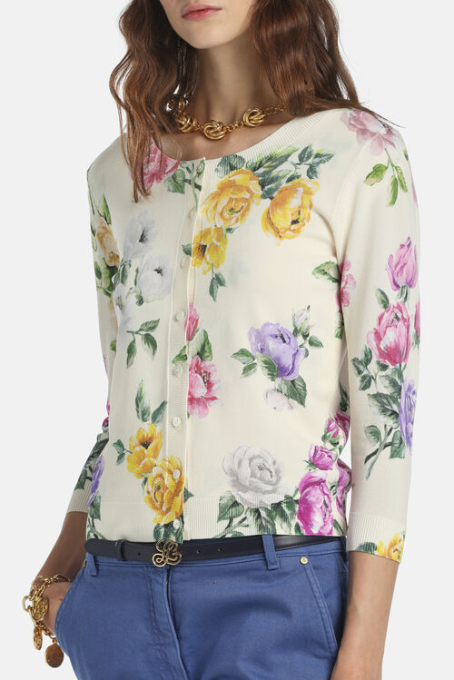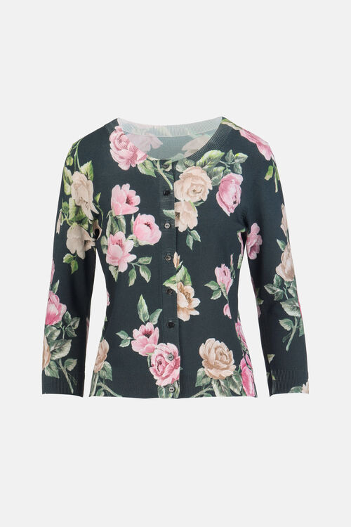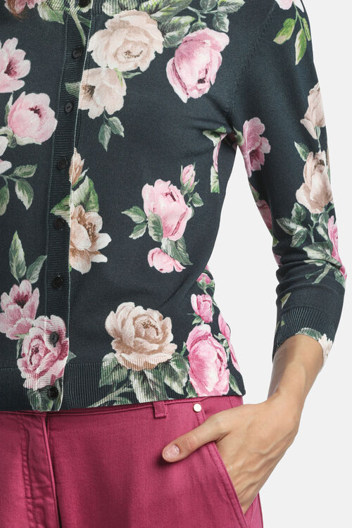 Кардиган из вязаного трикатажа, смесь вискозы, принтованный цветочным мотивом. Ворот украшен круглым вырезом, тональными пуговицами, рукавами 3/4 . Обычная посадка.