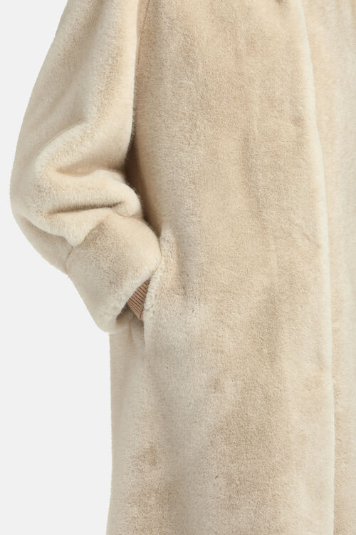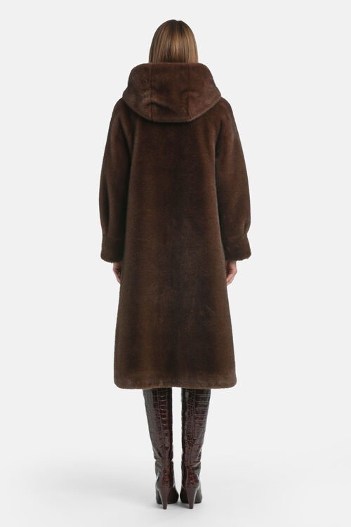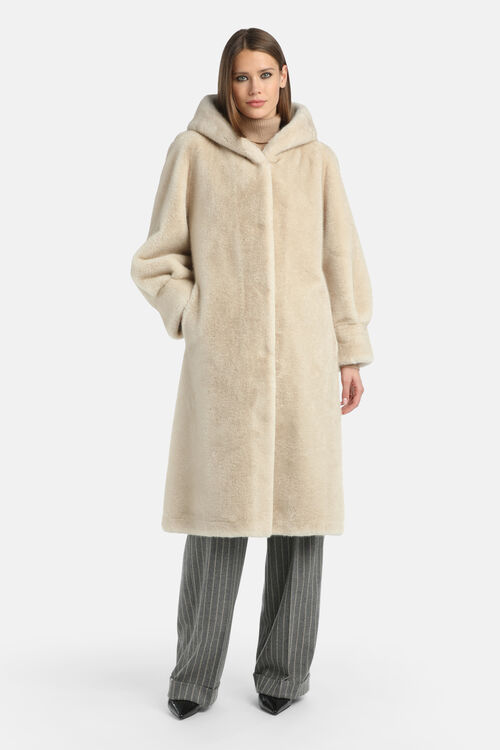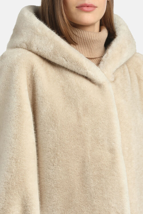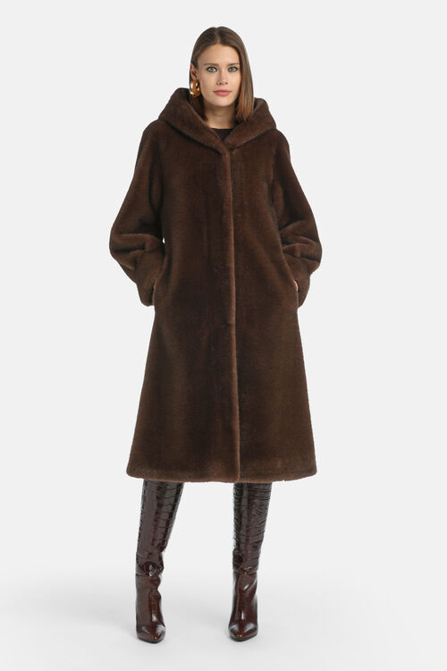 Плюшевая шуба из искусственного меха с широким капюшоном, боковыми карманами и потайной застежкой.