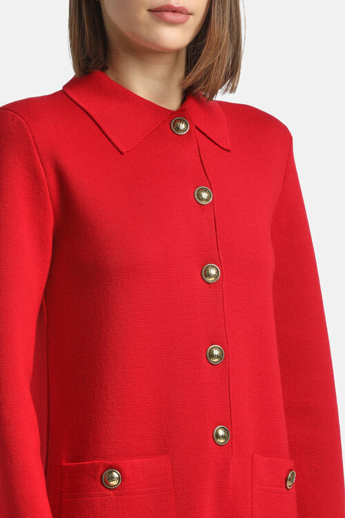 Имеет рубашечный воротник, прямой крой, геральдические пуговицы «LS» из металла золотистого оттенка, накладные карманы.