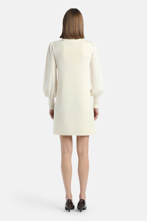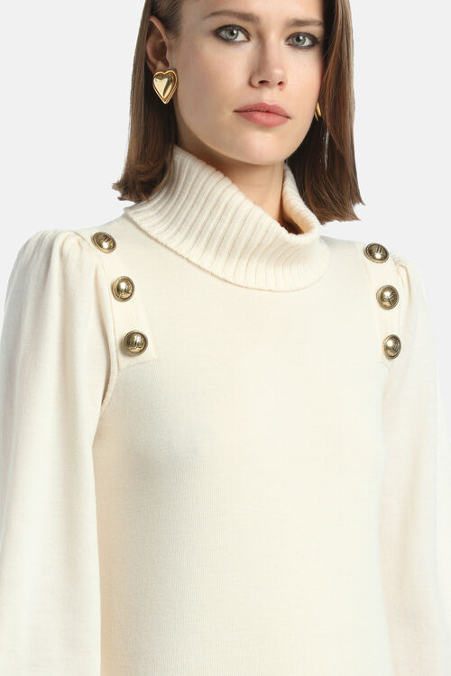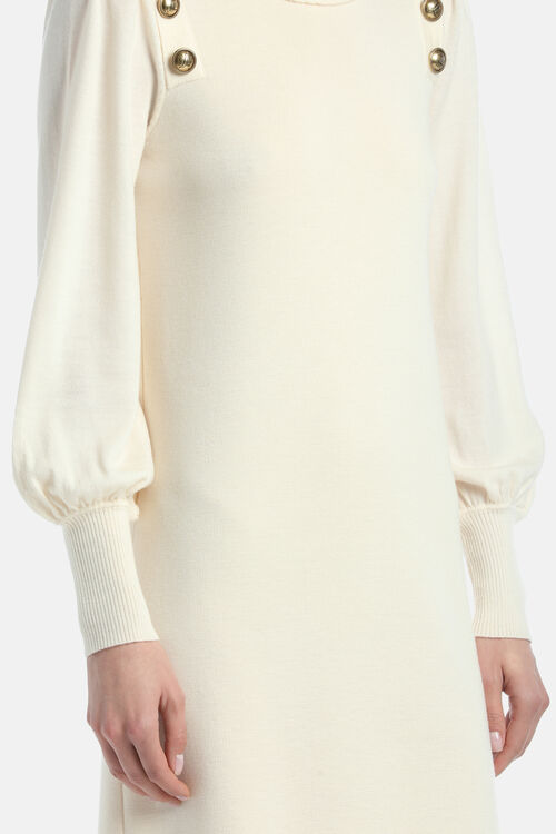 Мини-платье из чистой шерсти, гладкой вязки. Ребристая водолазка, рукава-фонарики с приталенными манжетами, прямой крой, золотистые геральдические пуговицы «LS». Длина выше колена. Классический крой.
