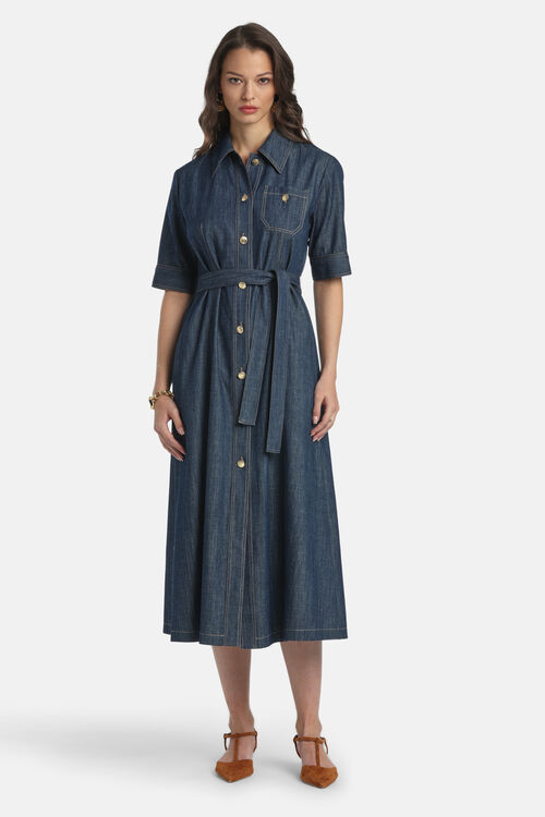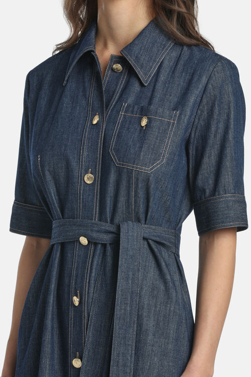 Платье миди из хлопкового джинса, рубашечного кроя. Контрастная строчка и длинна рукова 1/2, золотистые пуговицами «LS». Длина до середины икры. Обычная посадка.