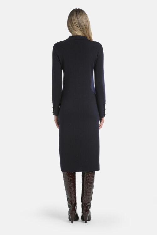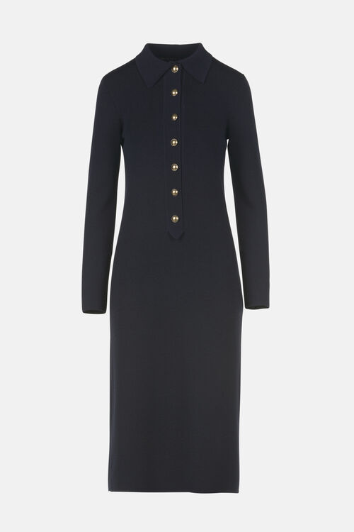 Платье-рубашка из чистой натуральной шерсти с тканевым переплетением. Отличается классическим воротником, планкой на частичных пуговицах с позолоченными коваными металлическими пуговицами. Длина ниже колена. Обычная посадка.