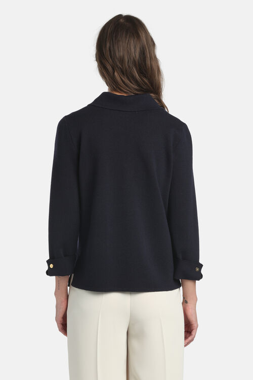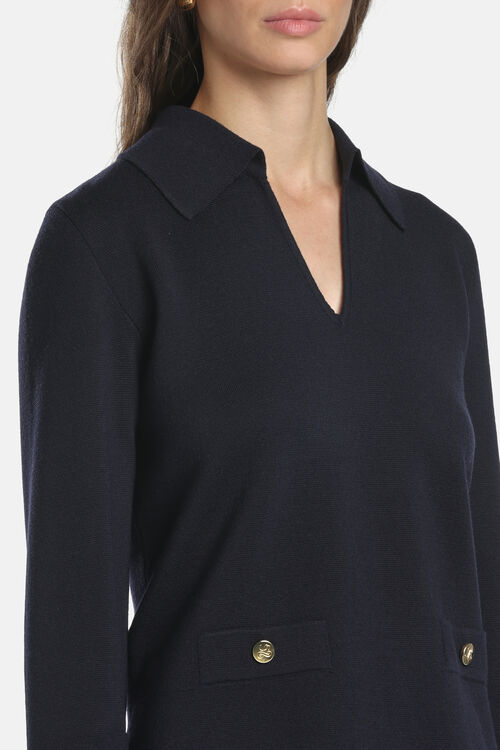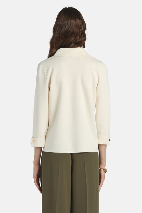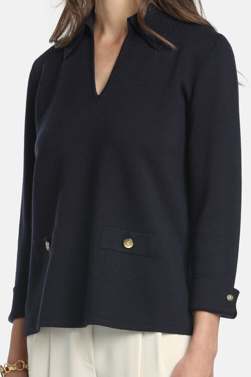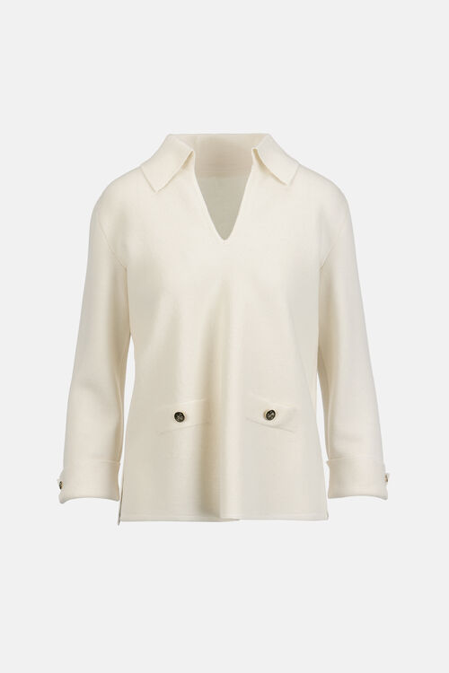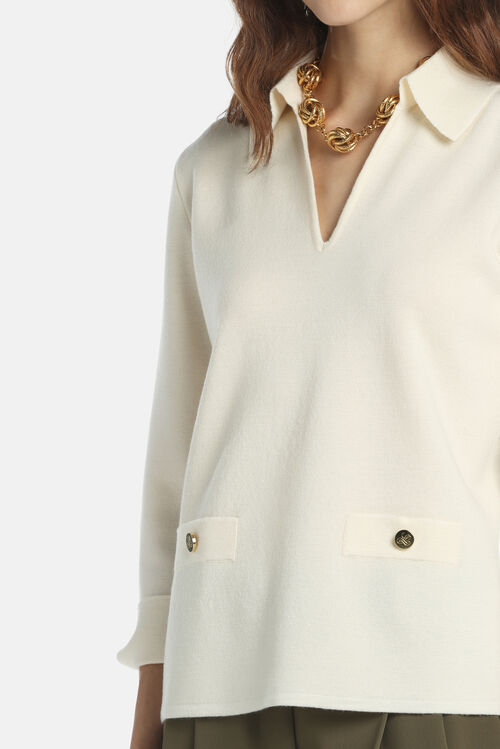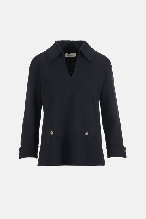Джемпер из натуральной шерсти. Открытый ворот в стиле поло, силуэт туника, золотистые пуговицы «LS». Длинный рукав с подворотом на пуговицах. Обычная посадка.