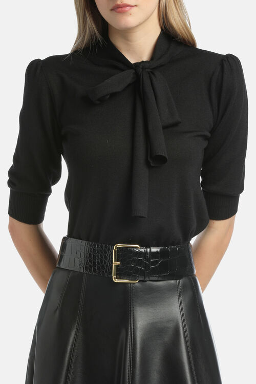 Ремень из лакированной кожи с тиснением под крокодила, с позолоченной металлической пряжкой и зубцом. Шлевка для ремня обтянута кожей в тон.