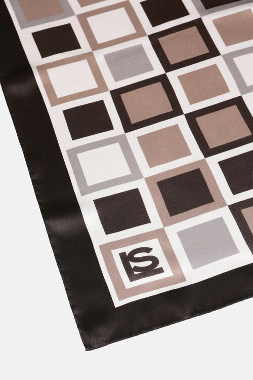 Шелковый платок с геометрическим рисунком, обрамленный однотонной каймой.