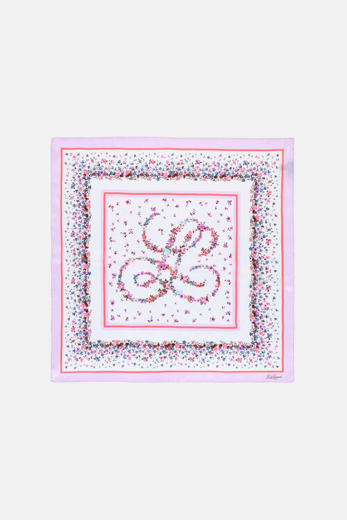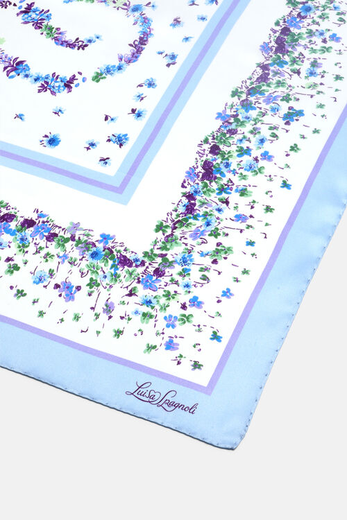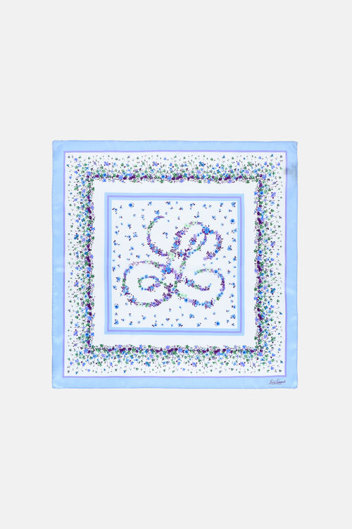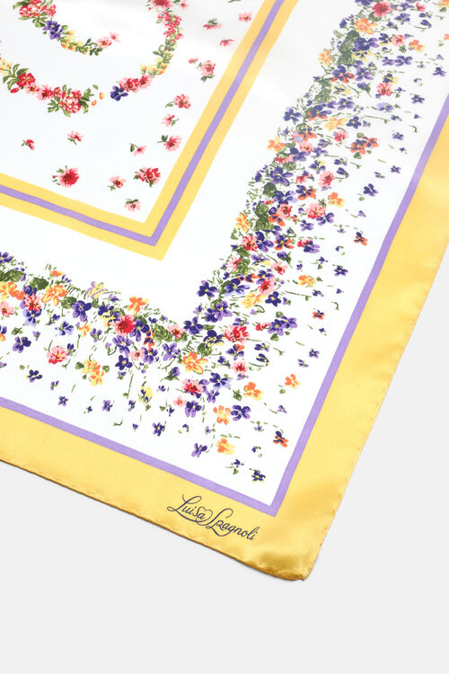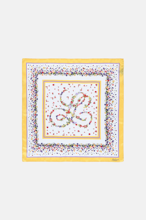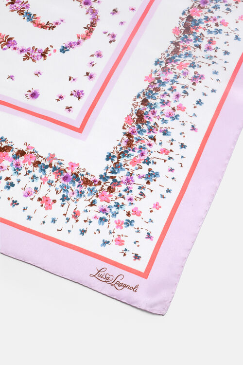 Чистый шелковый платок с нежным цветочным принтом и подписью Луизы Спаньоли в шрифте.