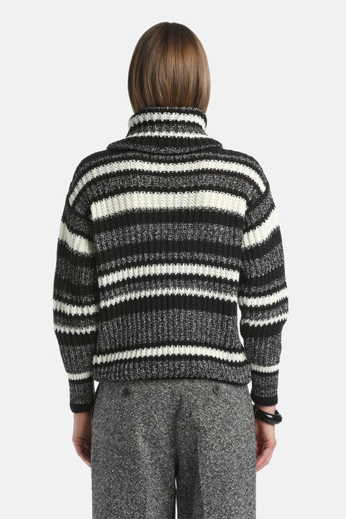 Водолазка из натурального трикотажа из смесовой шерсти, с разноцветными полосатыми узорами разной ширины.