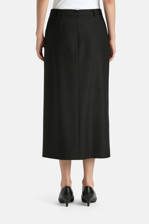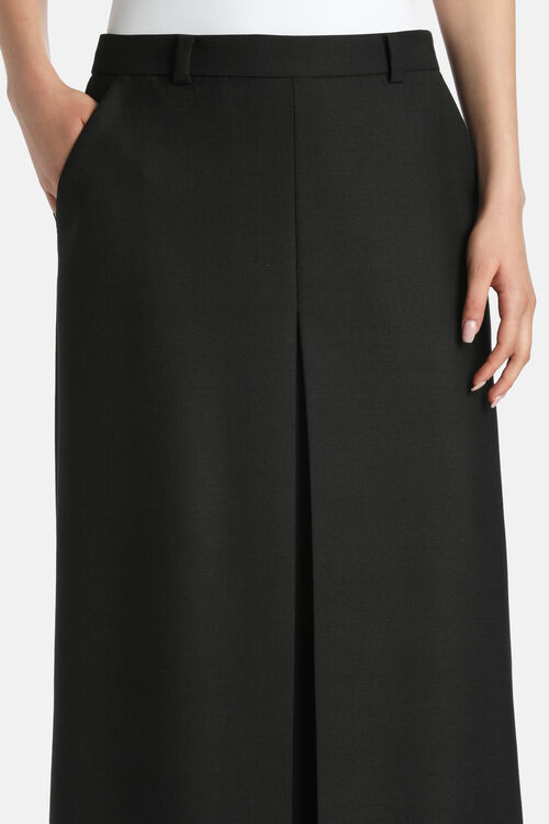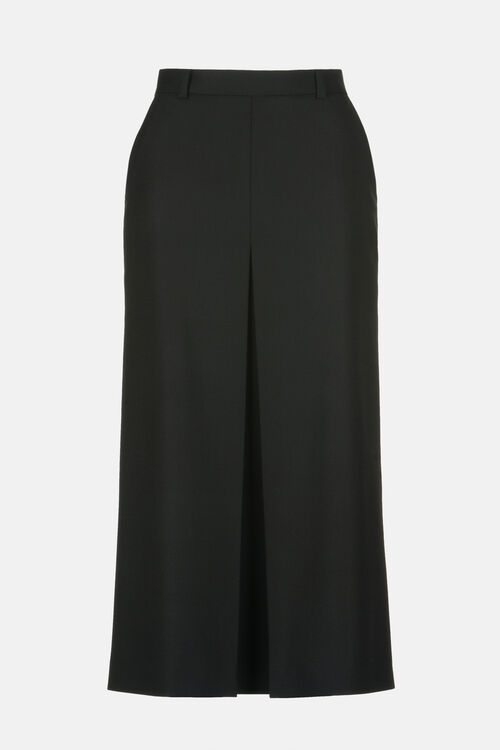 Юбка миди прямого кроя из смесовой шерсти с глубокой складкой спереди. Классический пояс со шлевками для ремня, боковые карманы и потайная молния сзади. Длина до середины голени. Классический крой.