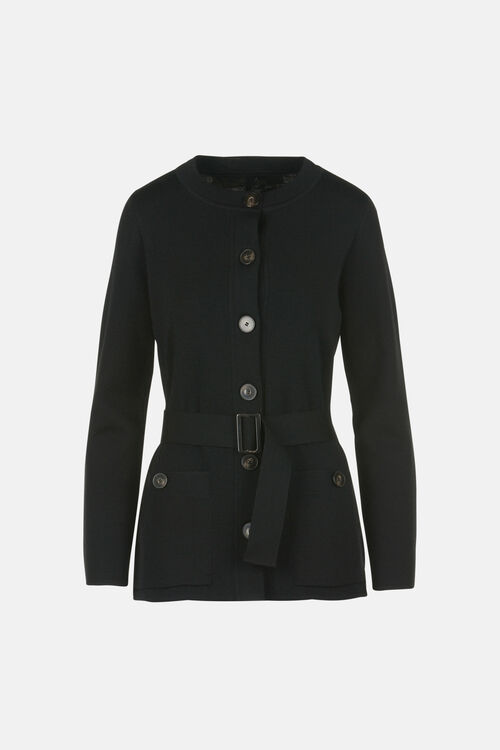 Кардиган из чистой натуральной шерсти с тканевым переплетением. Имеет круглый вырез горловины, плоские пуговицы, встроенный ремень с пряжкой и накладные карманы. Стандартная посадка.